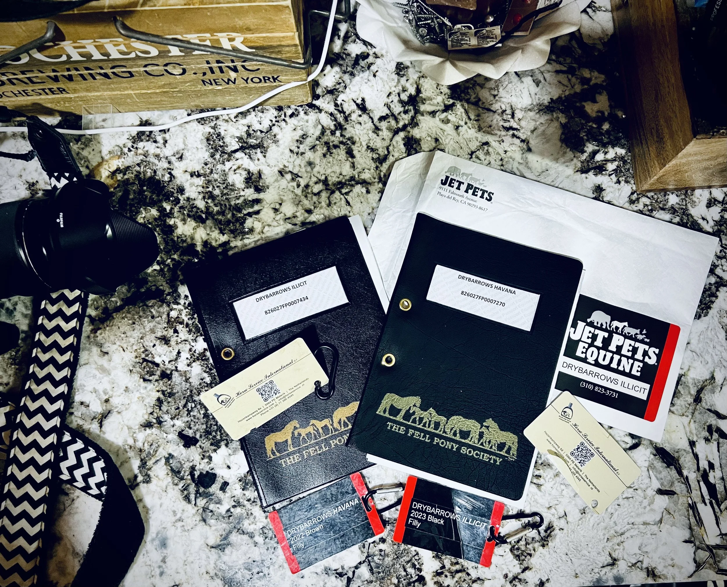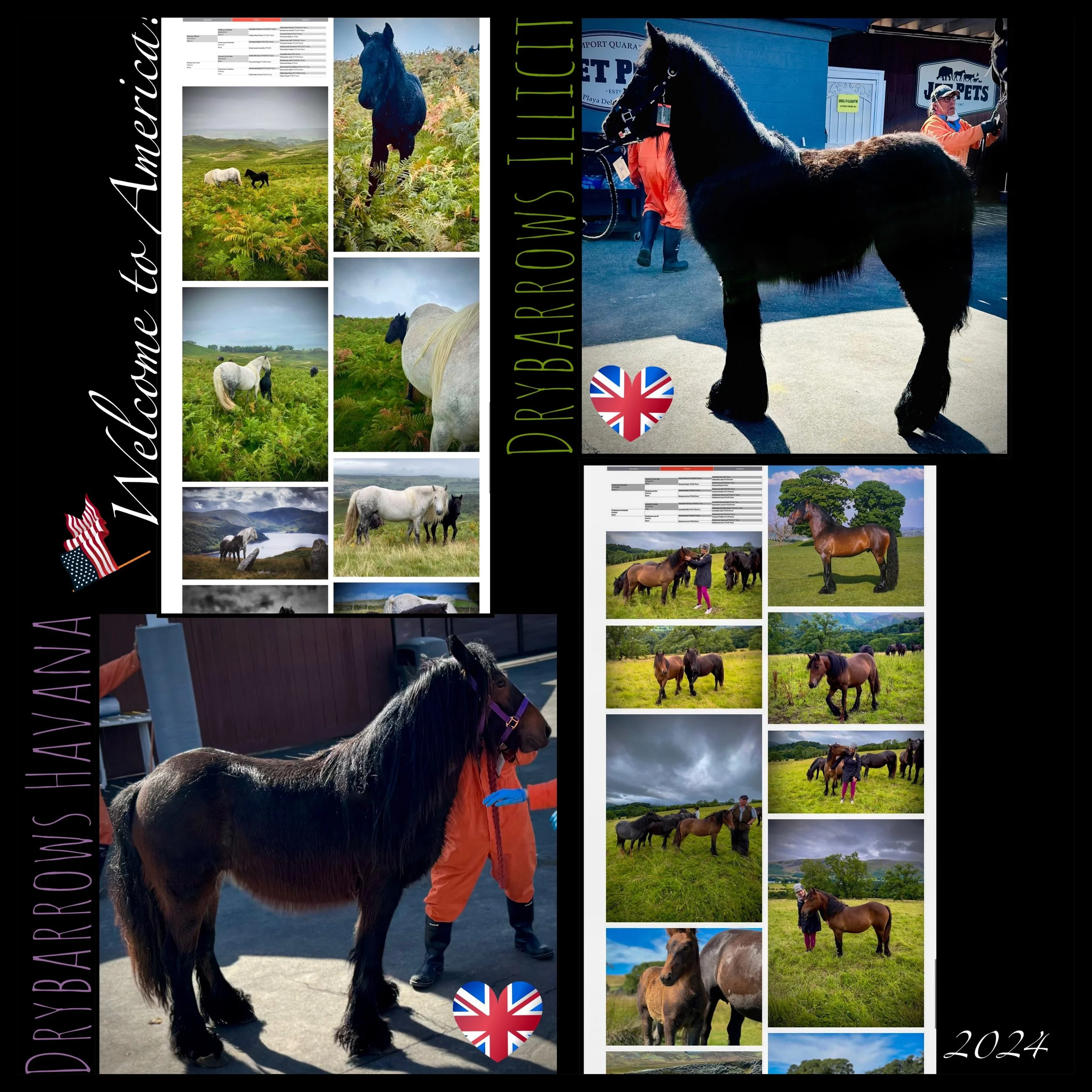 Drybarrows Havana and Drybarrows Illicit, purchased from the Northwest Auction hosted Hill Bred Gem Fell Pony Sale, 2022 & 2023. Imported by Feathered Foothill, 2024. Selected in person visiting the Drybarrows stud in 2023 & 2024.